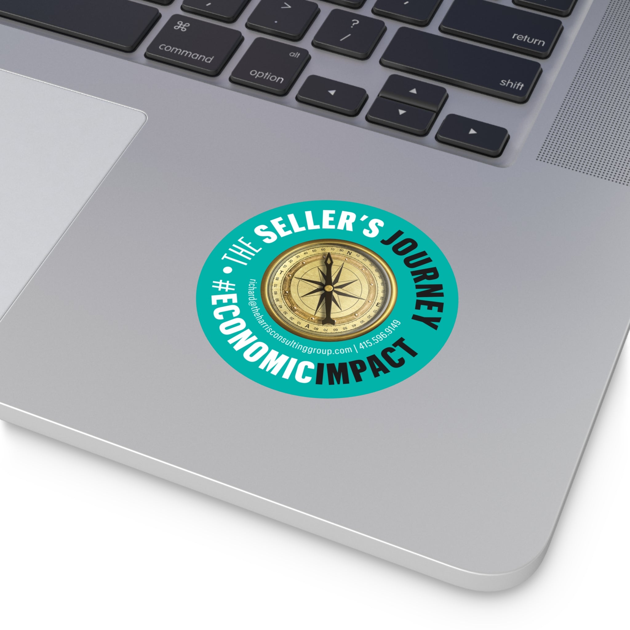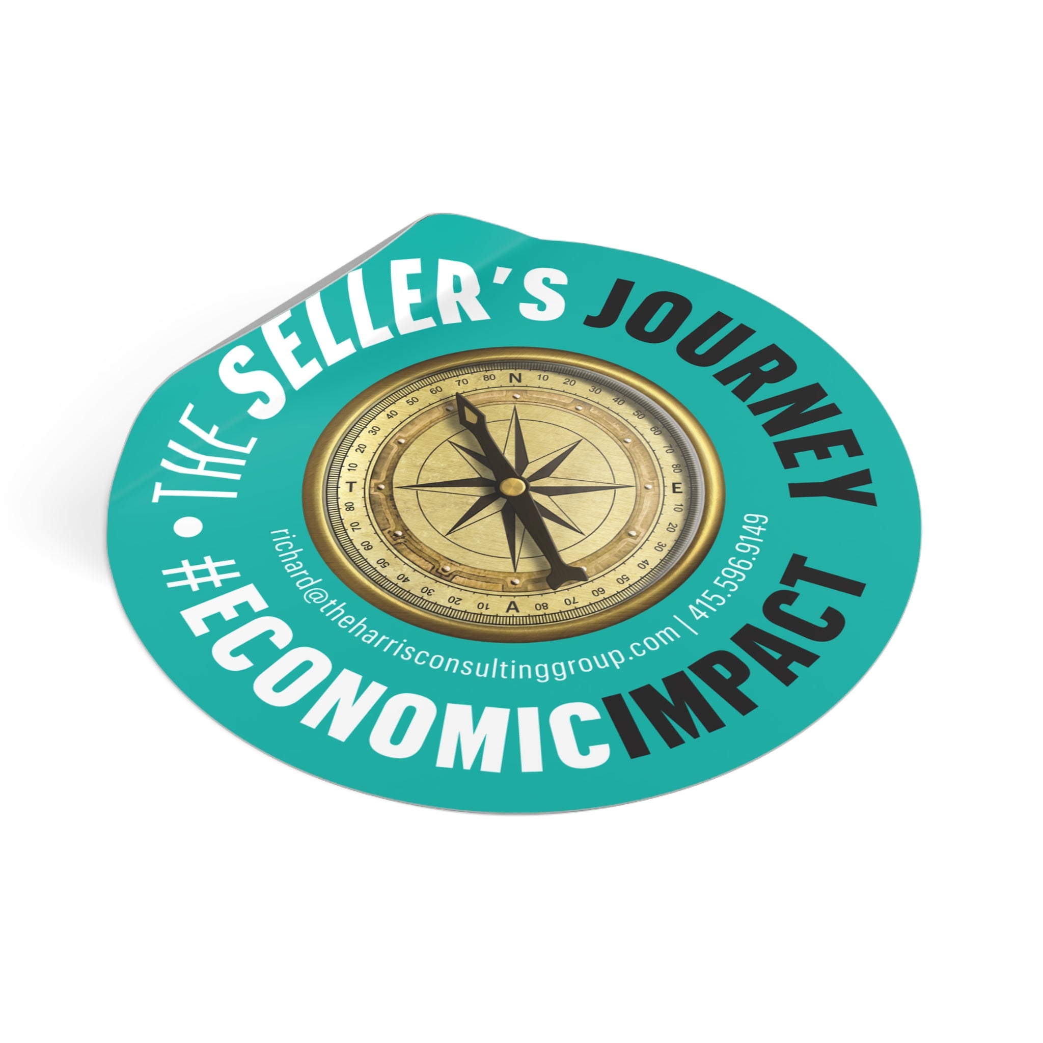 The Sellers Journey #EconomicImpact is a custom circle stickers are great for adding a touch of personality to any surface. These are rated to last over six years due to high-quality production. The base materials are premium vinyl and vibrant inks. The design layer is covered by a UV resistant laminate. If removal is necessary, the adhesive backing won't leave residue behind.